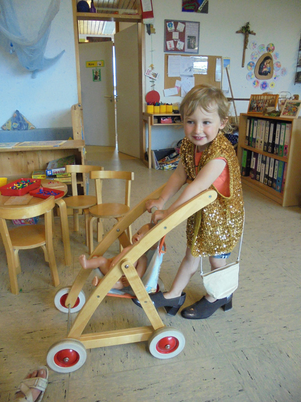 | Die Kinder haben die Möglichkeit sich zu verkleiden, in andere Rollen zu schlüpfen und das Familienleben nachzuspielen. Immer wechseln die Spielangebote: Arztpraxis, Friseursalon, Einkaufsladen oder auch mal eine Eisdiele finden ihren Platz. |
